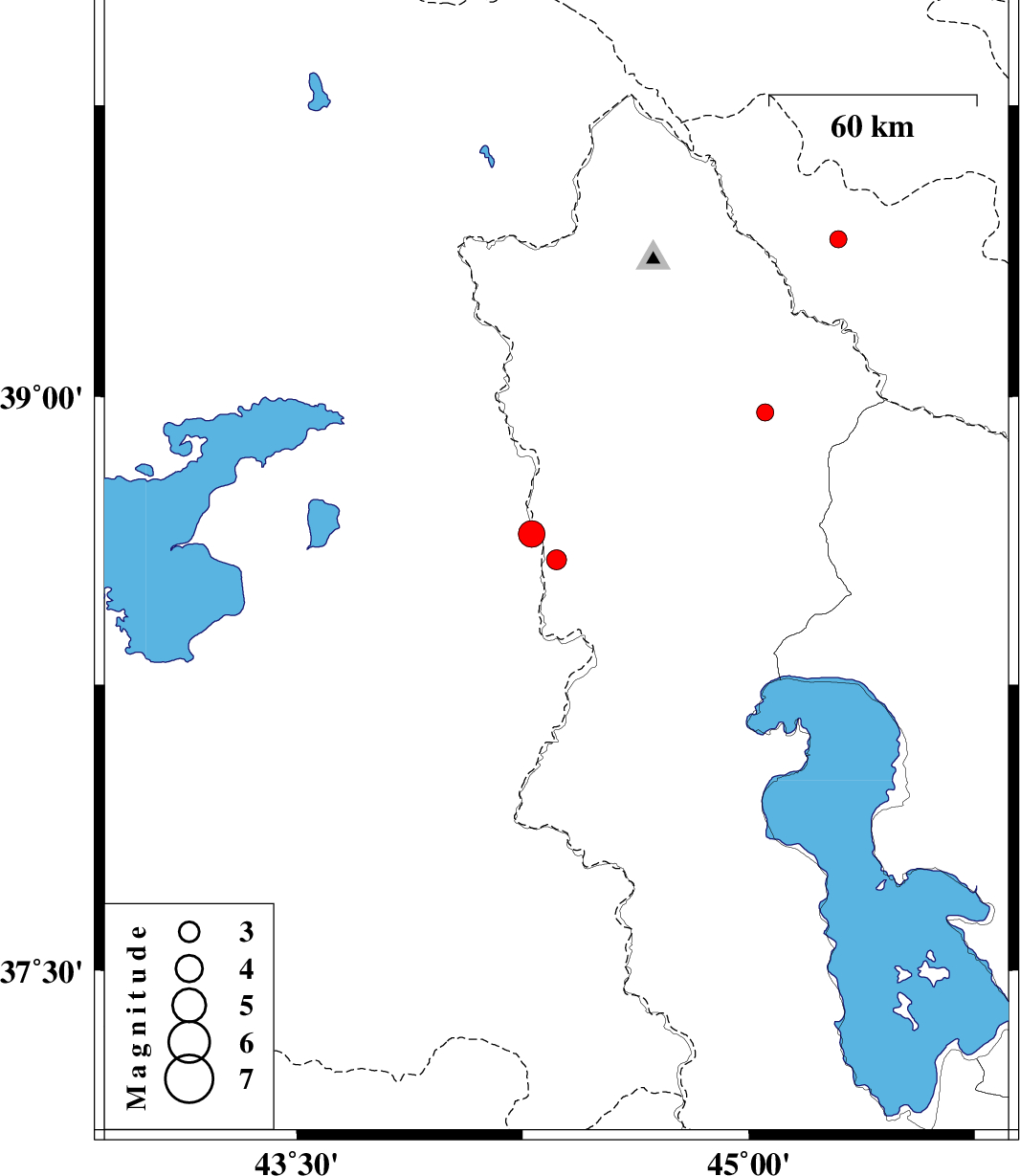| 2019/02/18 | 16:31:31.8 | 20:01:31.8 | 38.644 | 44.279 | 14 | ML3.9 | Azarbaijan Gharbi Province, 49 km South-West of Seyah Cheshmah |