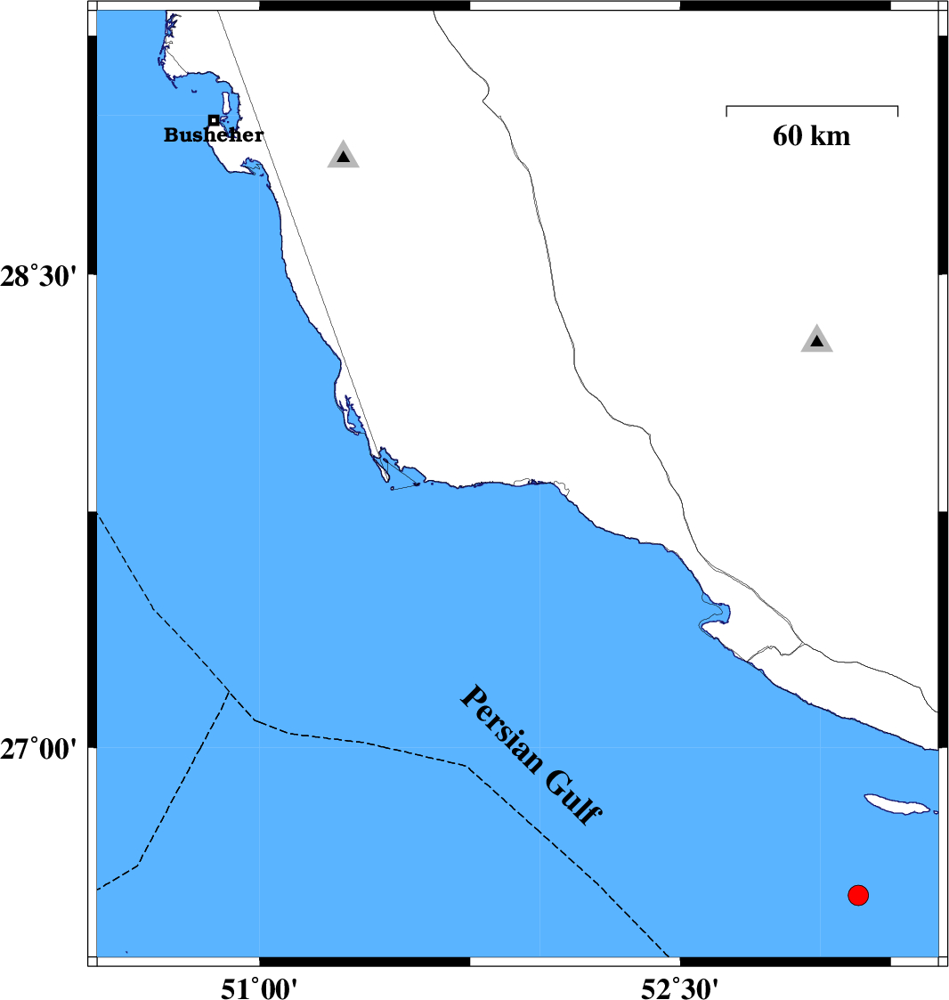 | 2019/03/01 | 07:16:26.9 | 10:46:26.9 | 27.77 | 51.793 | 34 | ML3.1 | Persian Gulf, 27 km -West of Bandar-e kangan | ||