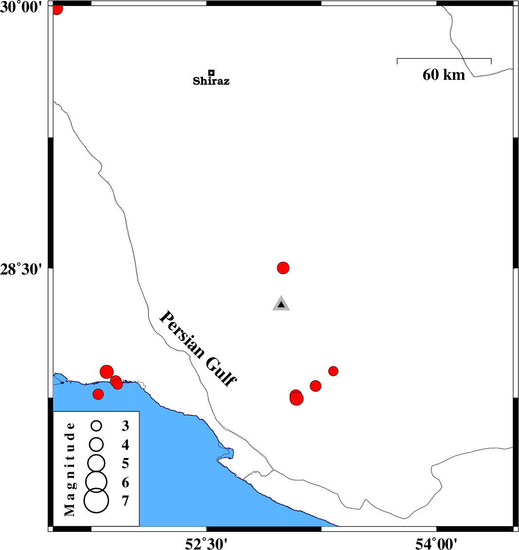 | 2019/03/01 | 07:40:04.3 | 11:10:04.3 | 27.829 | 51.92 | 34 | ML2.9 | Bushehr Province, 14 km -West of Bandar-e kangan | ||