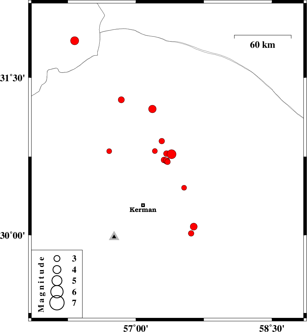 | 2019/02/22 | 15:18:50.4 | 18:48:50.4 | 30.779 | 57.338 | 14 | ML2.9 | Kerman Province, 60 km North-East of Kerman | ||
