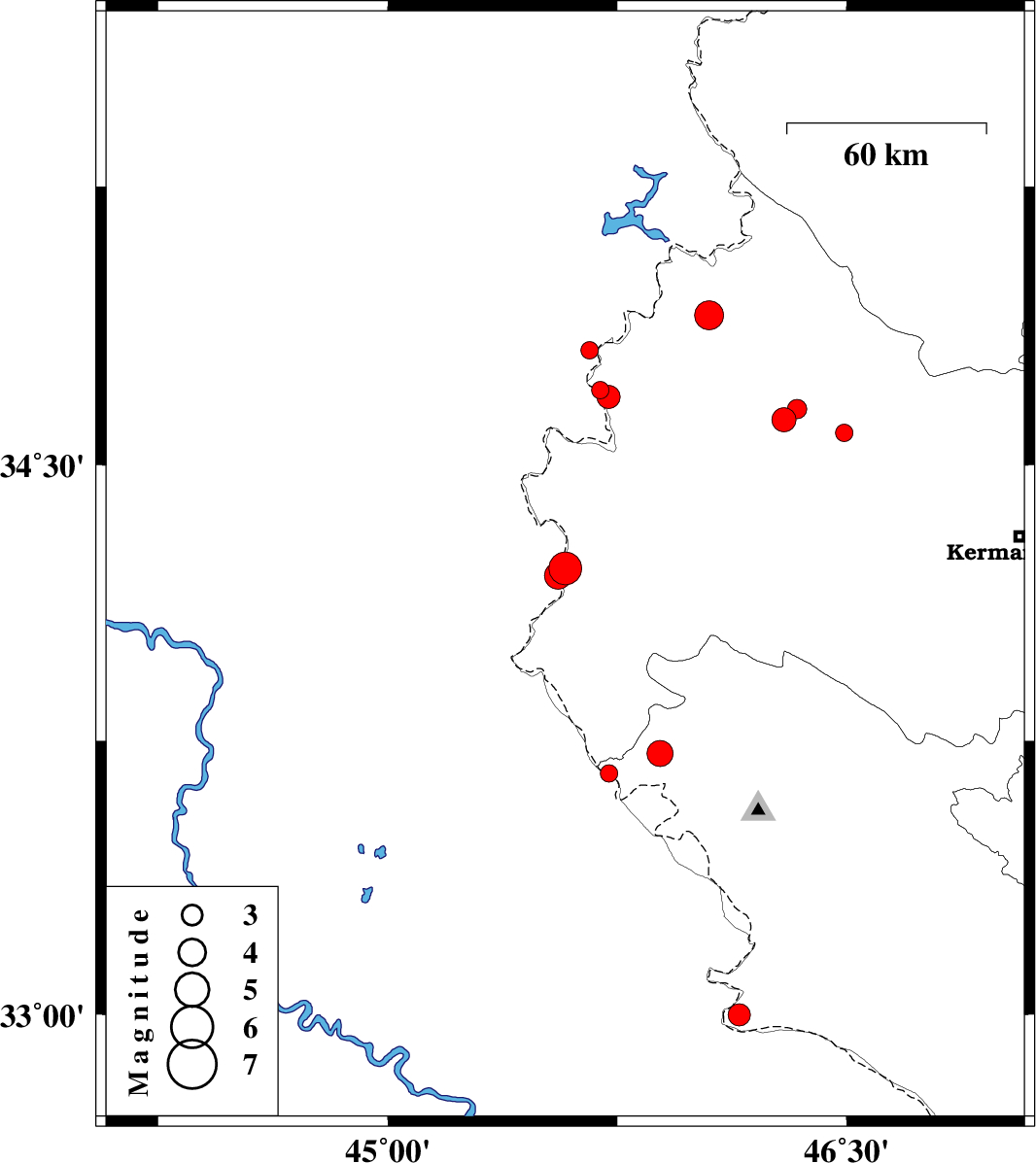 | 2019/03/12 | 12:06:06.3 | 15:36:06.3 | 34.22 | 45.58 | 7 | ML4.8 | Kermanshah Province, 33 km South of Qasr-E-Shirin | ||