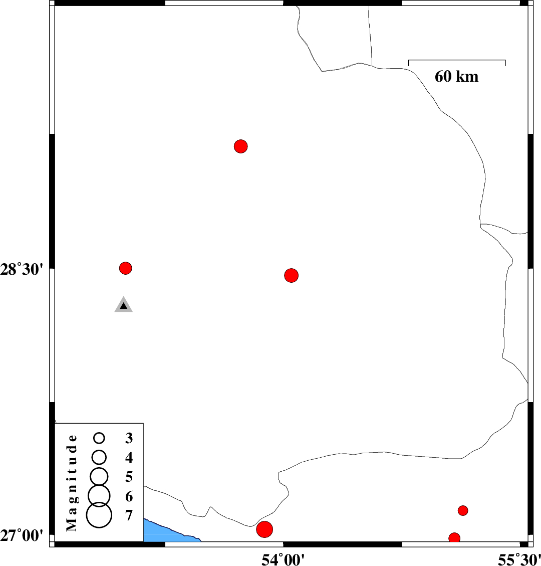 | 2019/02/23 | 20:03:49.5 | 23:33:49.5 | 26.978 | 55.083 | 7 | ML3.2 | Hormozgan Province, 55 km North-East of Bandar-e lengeh |