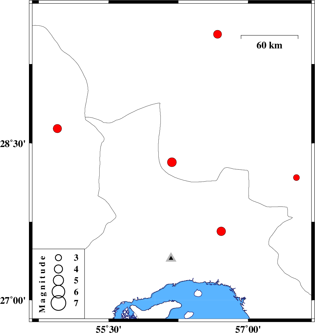 | 2019/03/27 | 06:19:31.6 | 10:49:31.6 | 27.66 | 56.71 | 10 | Mb4.3 | Hormozgan Province, 58 km North-West of Dehbarez | ||