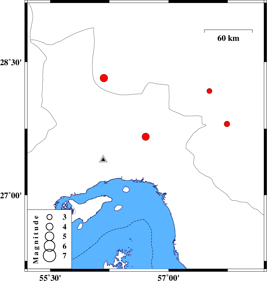 | 2019/02/25 | 23:26:50.6 | 02:56:50.6 | 27.804 | 57.741 | 14 | ML3.2 | Kerman Province, 17 km South of Kahnuj |
