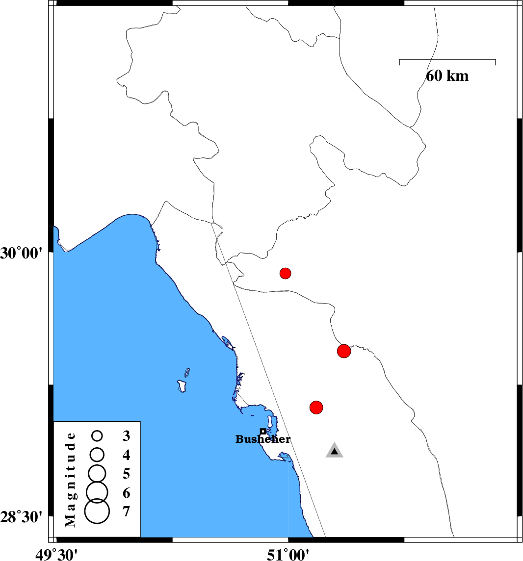 | 2019/04/21 | 13:33:05.8 | 18:03:05.8 | 29.44 | 51.36 | 10 | ML3.9 | Bushehr Province, 25 km North-East of Borazjan | ||