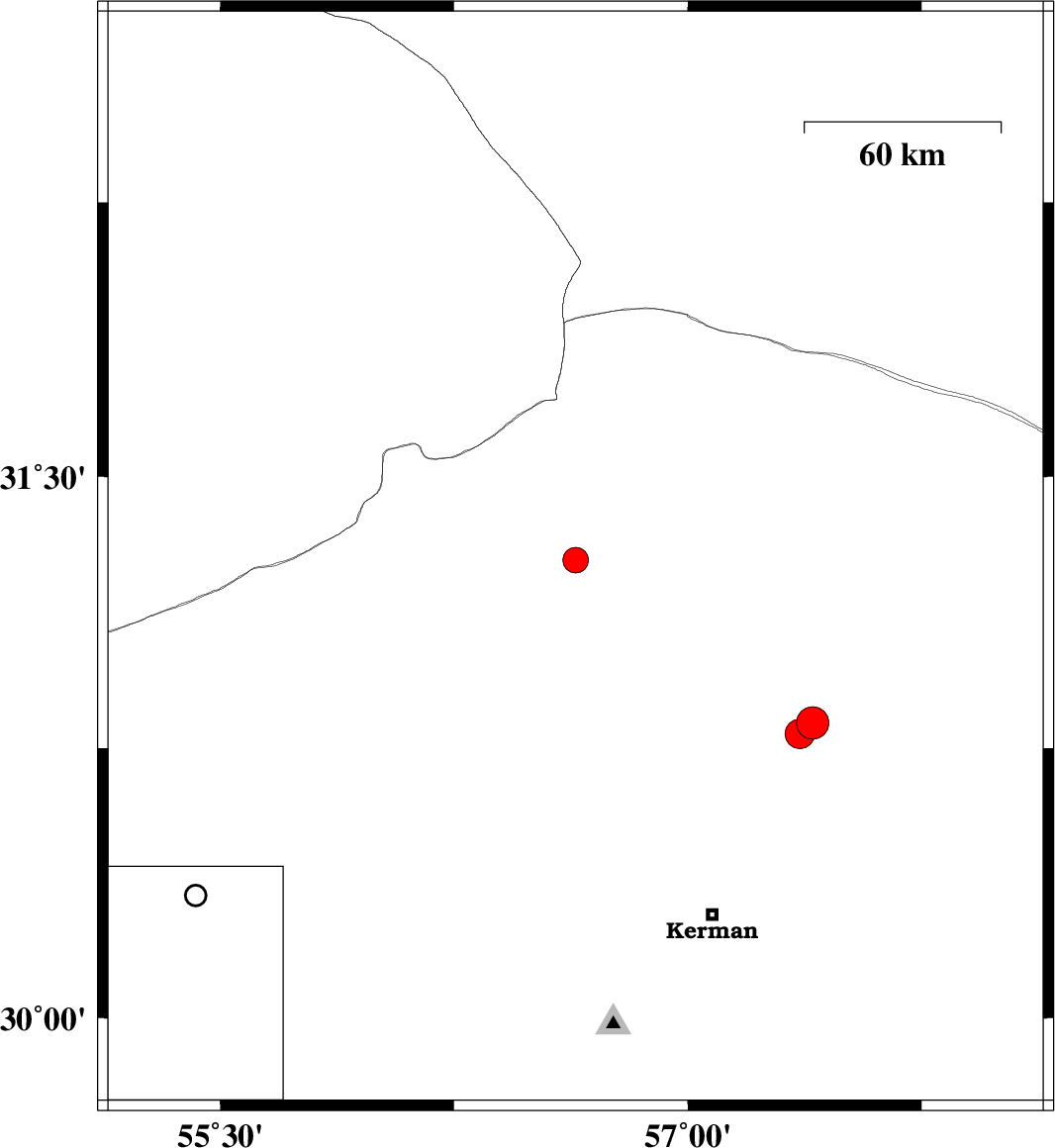 | 2019/04/16 | 22:43:48.4 | 03:13:48.4 | 30.79 | 57.36 | 10 | Mb4.3 | Kerman Province, 62 km North-East of Kerman |