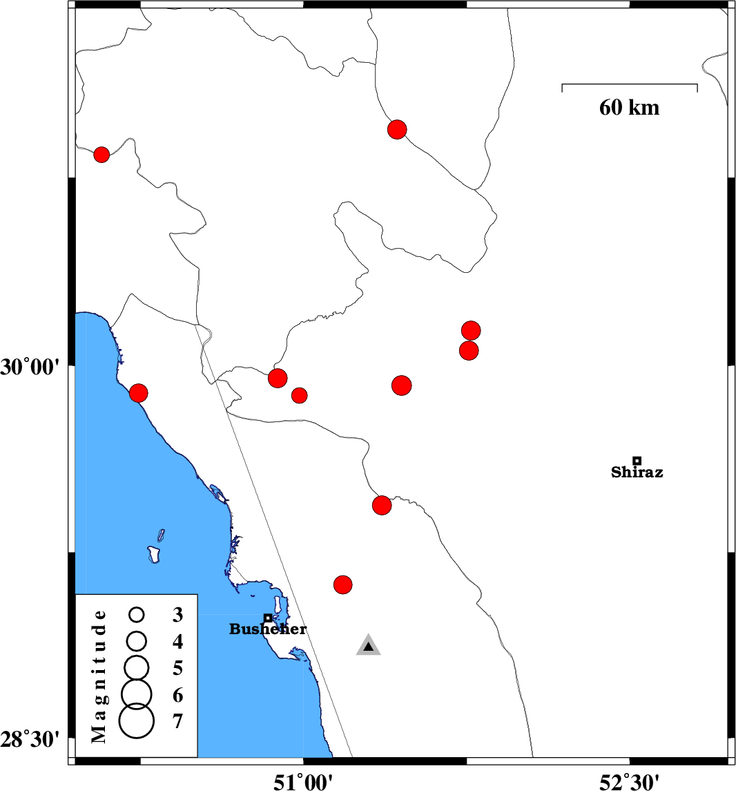 | 2019/04/21 | 13:33:05.8 | 18:03:05.8 | 29.44 | 51.36 | 10 | ML3.9 | Bushehr Province, 25 km North-East of Borazjan | ||