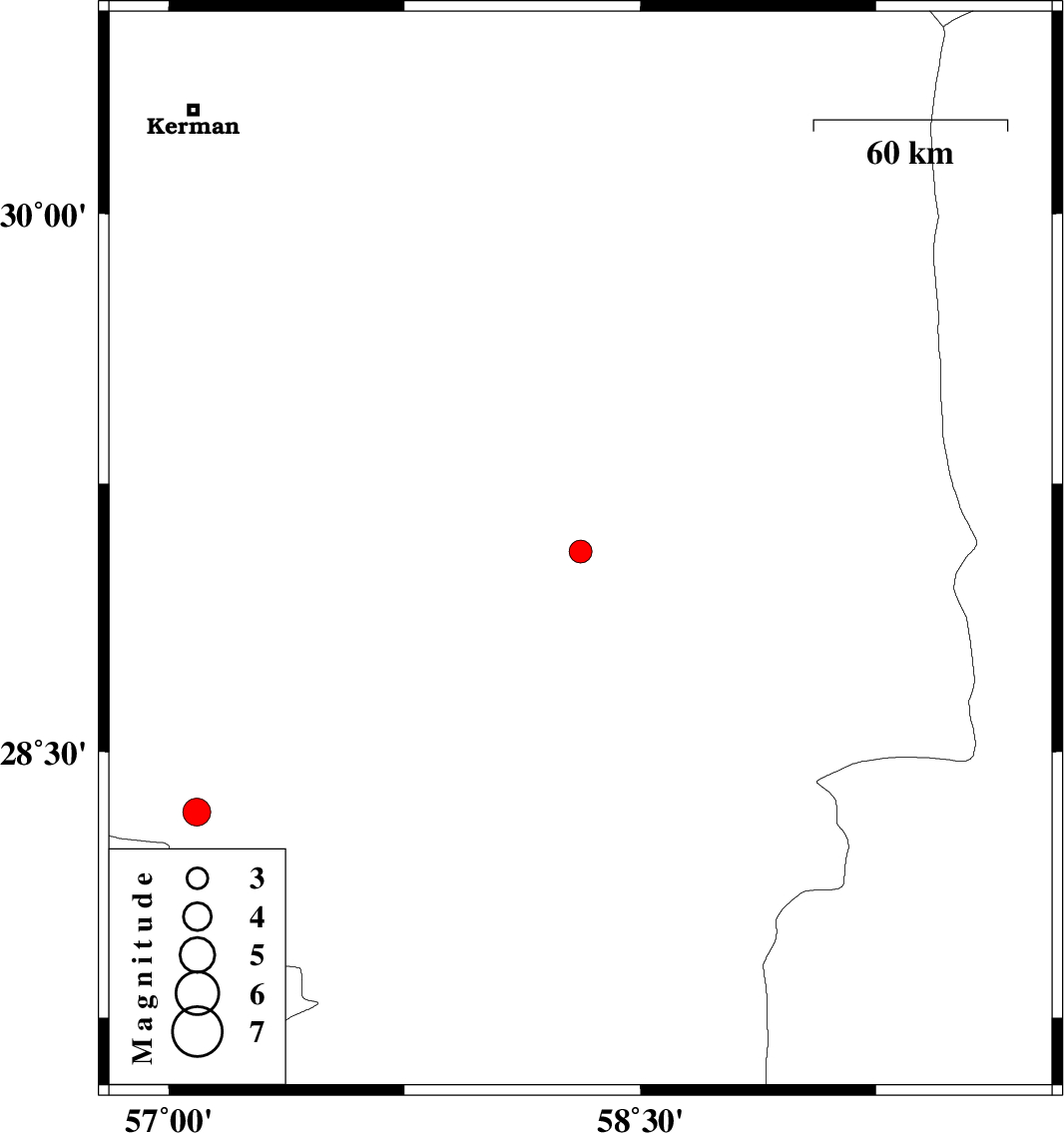 | 2019/05/11 | 23:30:14.6 | 04:00:14.6 | 28.33 | 57.09 | 10 | ML4 | Kerman Province, 73 km North-West of Kahnuj |