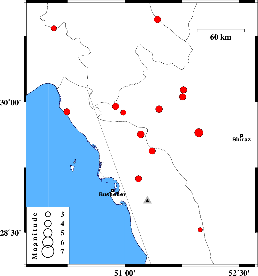 | 2019/04/21 | 13:33:05.8 | 18:03:05.8 | 29.44 | 51.36 | 10 | ML3.9 | Bushehr Province, 25 km North-East of Borazjan | ||