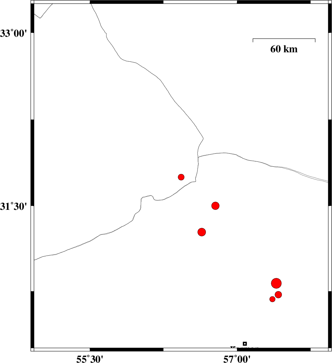 2019/05/11 | 11:39:59.9 | 16:09:59.9 | 31.5 | 56.78 | 7 | ML:3.5 | Kerman Province, 26 km North of Ravar | ||
