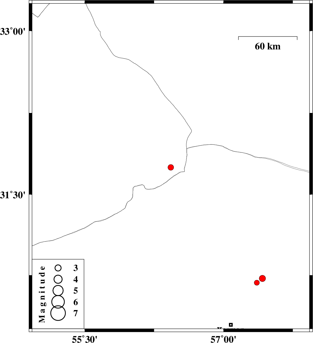 | 2019/05/12 | 16:40:03.0 | 21:10:03.0 | 30.72 | 57.42 | 10 | ML3.1 | Kerman Province, 58 km North-East of Kerman |