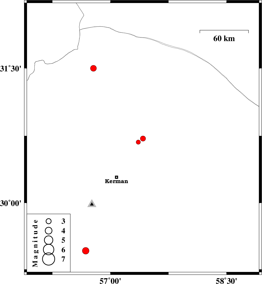 | 2019/05/06 | 10:50:51.4 | 15:20:51.4 | 29.46 | 56.68 | 15 | ML3.9 | Kerman Province, 26 km North of Baft |