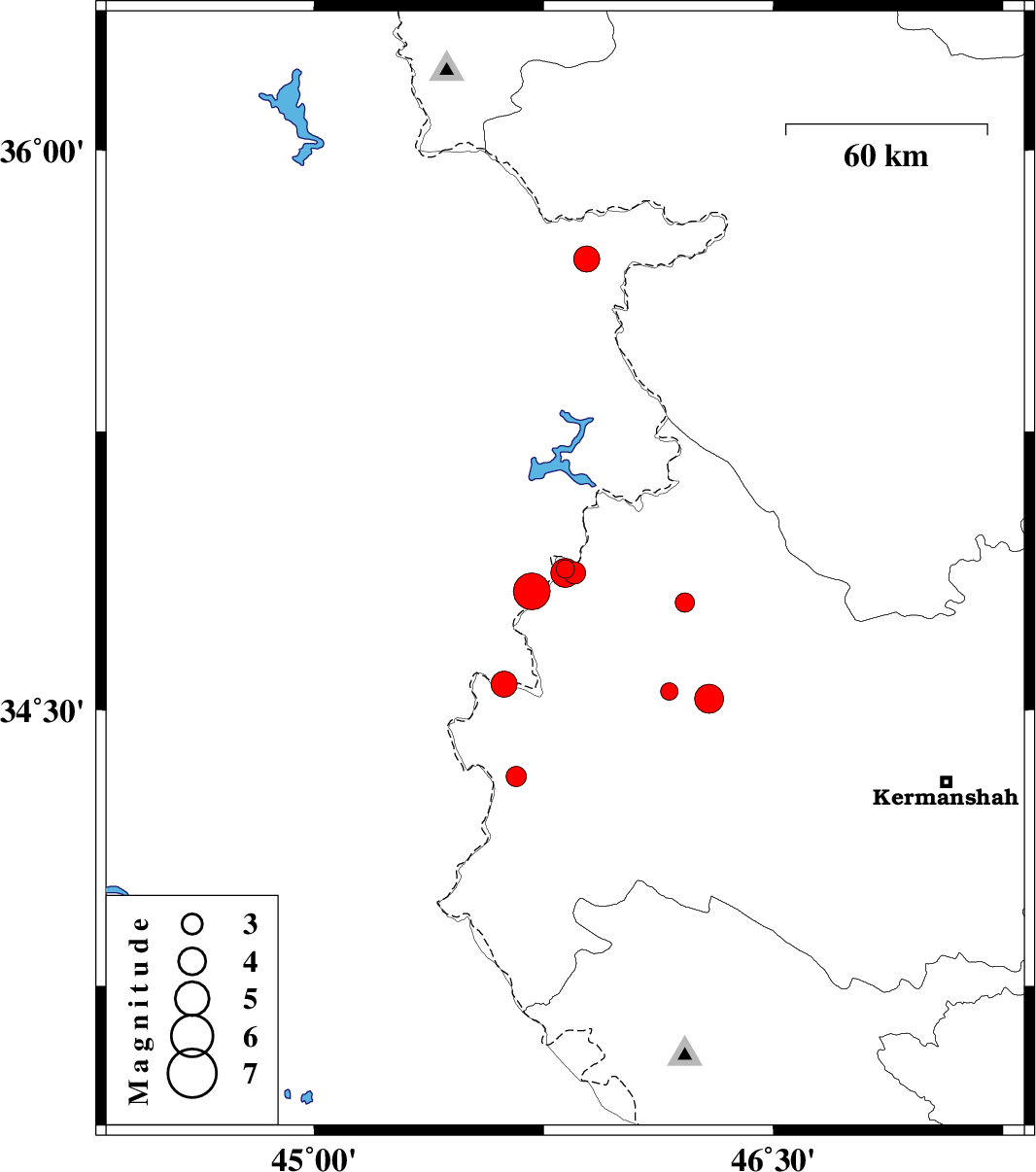 | 2019/05/11 | 04:19:11.1 | 08:49:11.1 | 34.32 | 45.66 | 6 | ML2.9 | Kermanshah Province, 23 km South of Qasr-E-Shirin | ||
