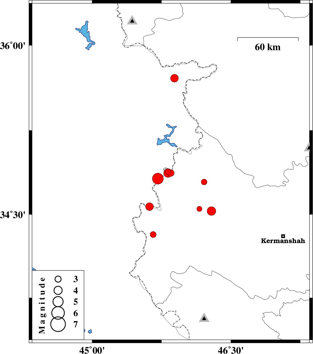 | 2019/05/11 | 10:28:59.8 | 14:58:59.8 | 34.82 | 45.71 | 16 | ML5.4 | Kermanshah Province, 13 km -West of Tazehabad | ||