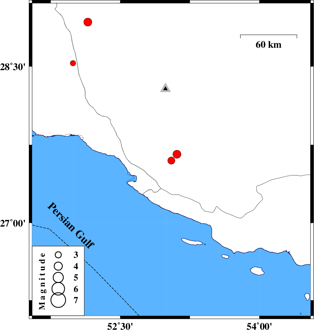 | 2019/05/19 | 01:29:36.9 | 05:59:36.9 | 28.53 | 51.99 | 5 | ML2.7 | Bushehr Province, 39 km South of Farashband | ||