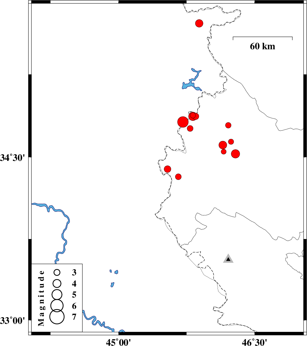 | 2019/05/11 | 04:19:11.1 | 08:49:11.1 | 34.32 | 45.66 | 6 | ML2.9 | Kermanshah Province, 23 km South of Qasr-E-Shirin |