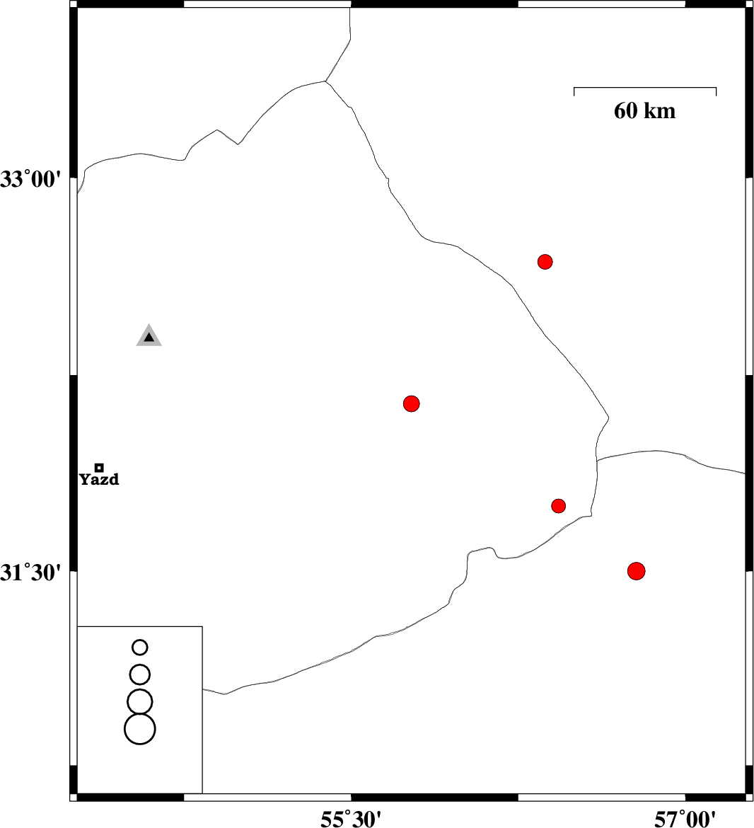 | 2019/05/11 | 11:39:59.9 | 16:09:59.9 | 31.5 | 56.78 | 7 | ML3.5 | Kerman Province, 26 km North of Ravar |