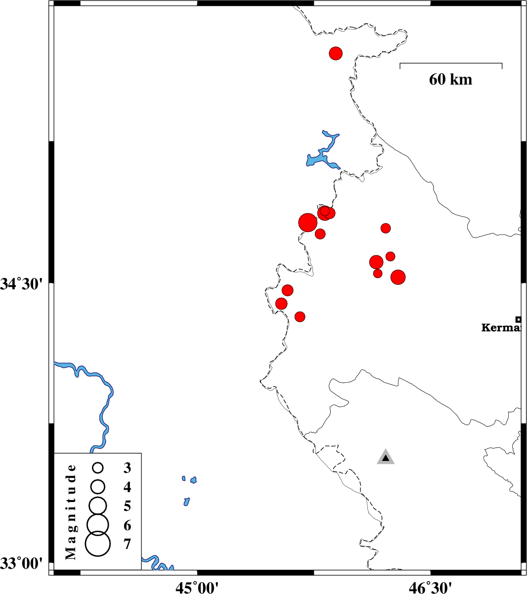 | 2019/05/11 | 10:28:59.8 | 14:58:59.8 | 34.82 | 45.71 | 16 | ML5.4 | Kermanshah Province, 13 km -West of Tazehabad | ||