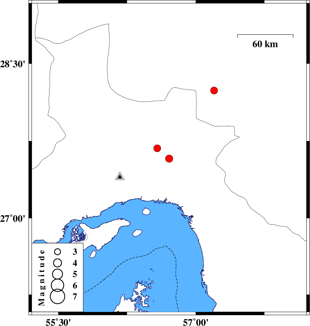 | 2019/05/29 | 16:01:35.8 | 20:31:35.8 | 28.24 | 57.2 | 12 | ML3.5 | Kerman Province, 58 km North-West of Kahnuj |