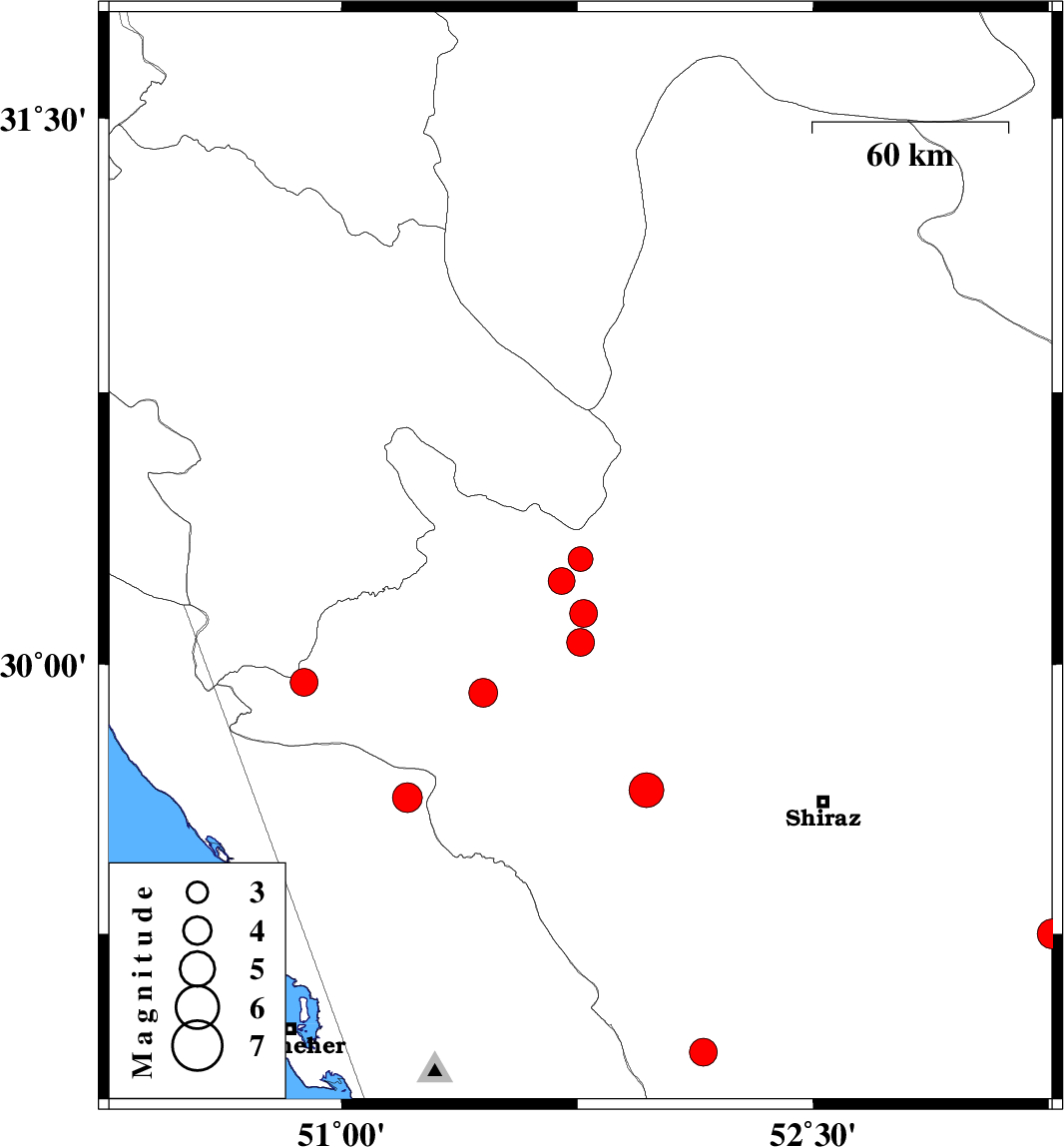| 2019/05/02 | 15:39:29.4 | 20:09:29.4 | 29.95 | 50.88 | 10 | ML4 | Fars Province, 46 km South of Dogonbadan |