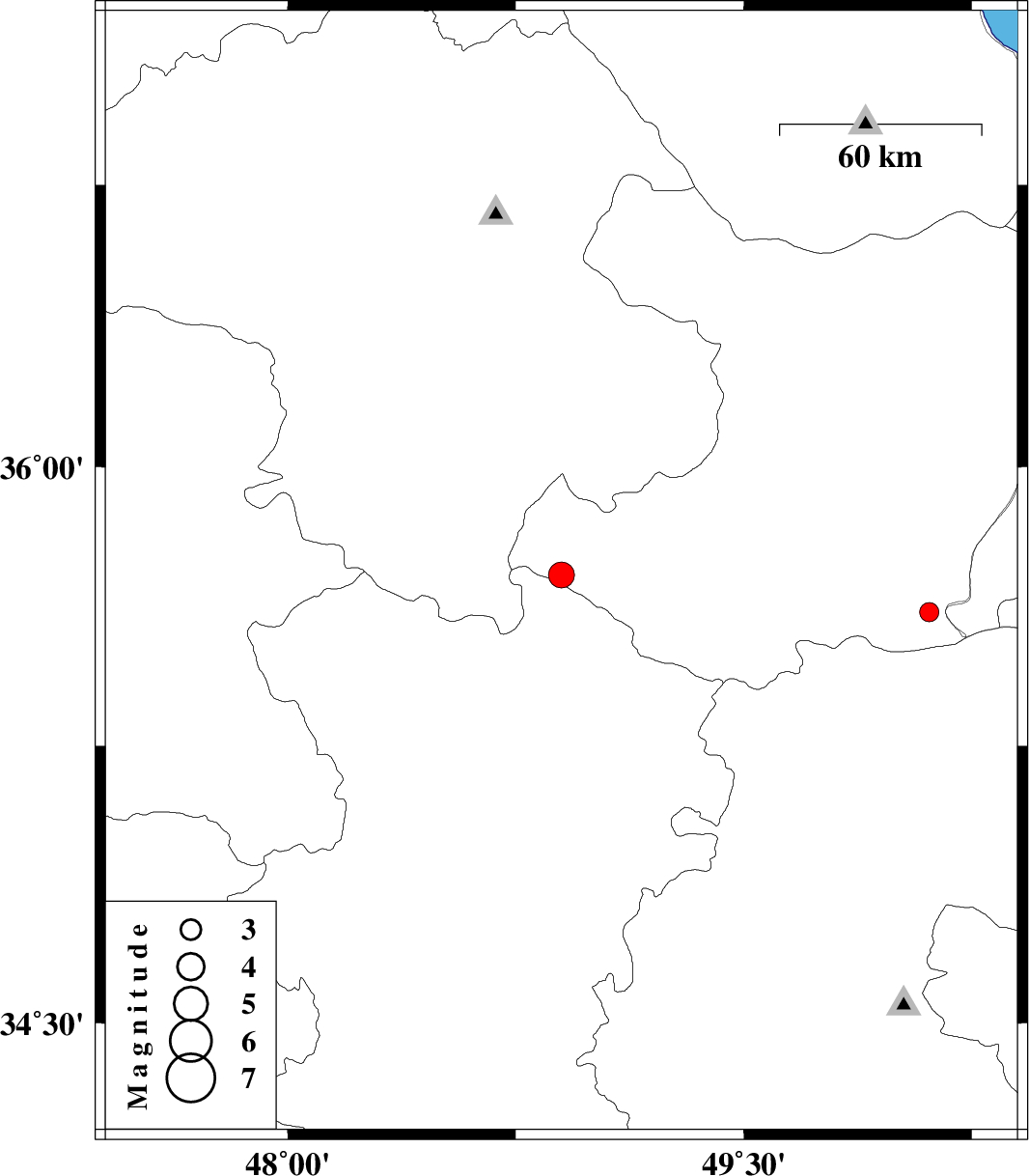 | 2019/06/14 | 04:21:02.9 | 08:51:02.9 | 35.71 | 48.9 | 10 | ML3.8 | Ghazvin Province, 38 km North-West of Razan |