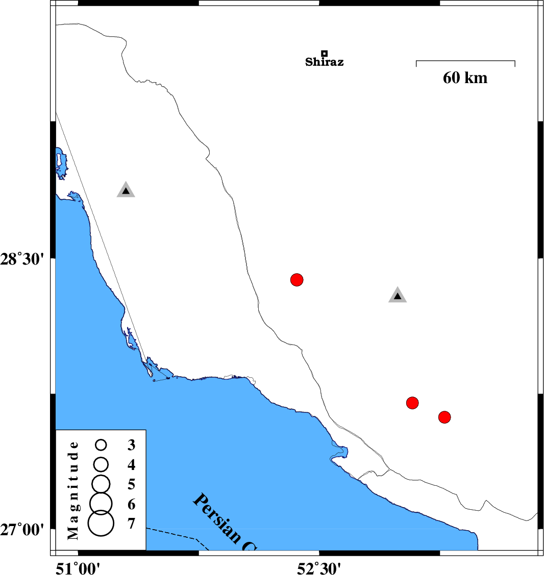 | 2019/06/15 | 07:46:44.8 | 12:16:44.8 | 28.38 | 52.36 | 18 | ML3.5 | Fars Province, 61 km North of Jam | ||