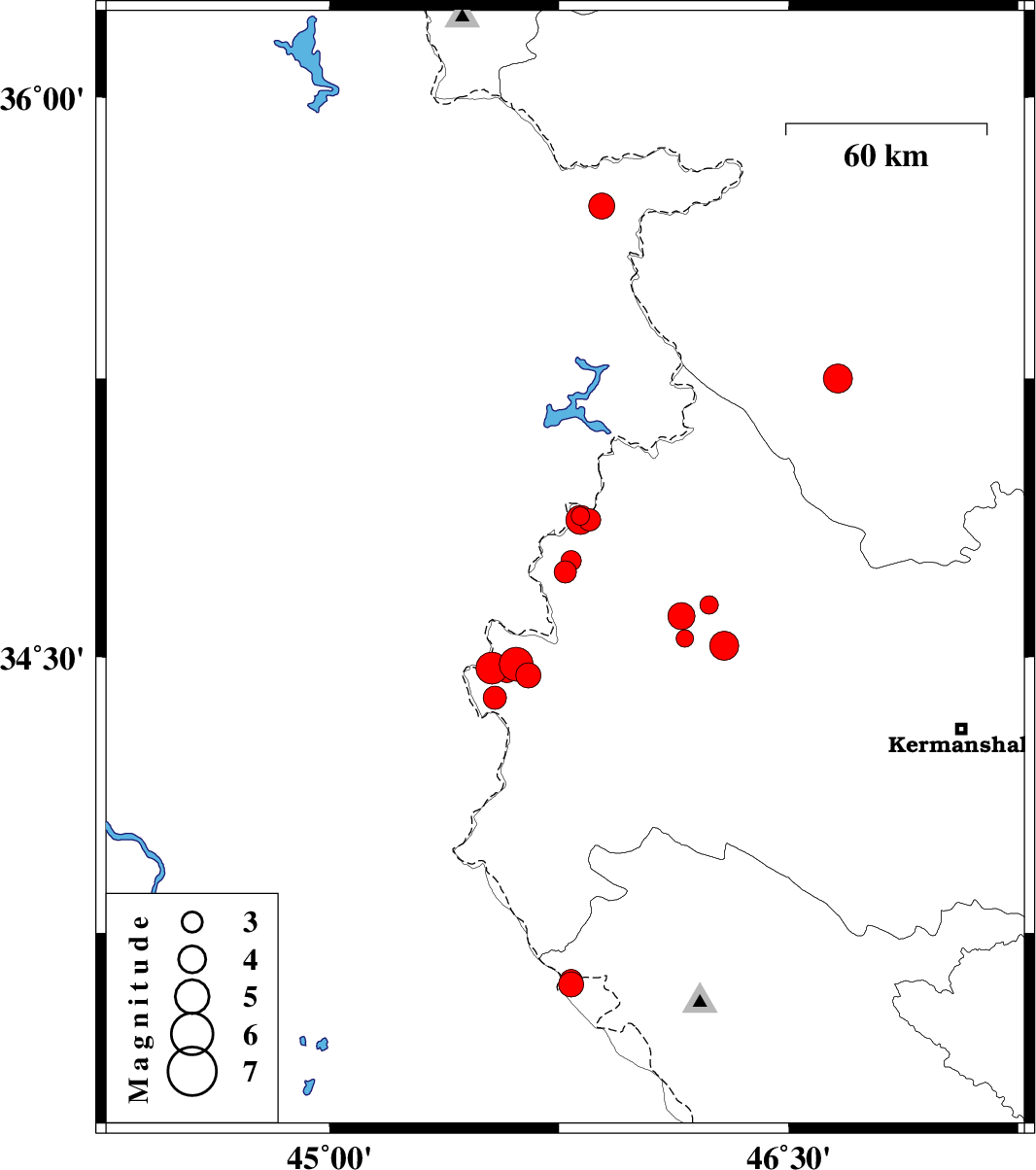 | 2019/05/28 | 17:38:58.1 | 22:08:58.1 | 34.39 | 45.54 | 11 | ML3.4 | Kermanshah Province, 15 km South of Qasr-E-Shirin | ||