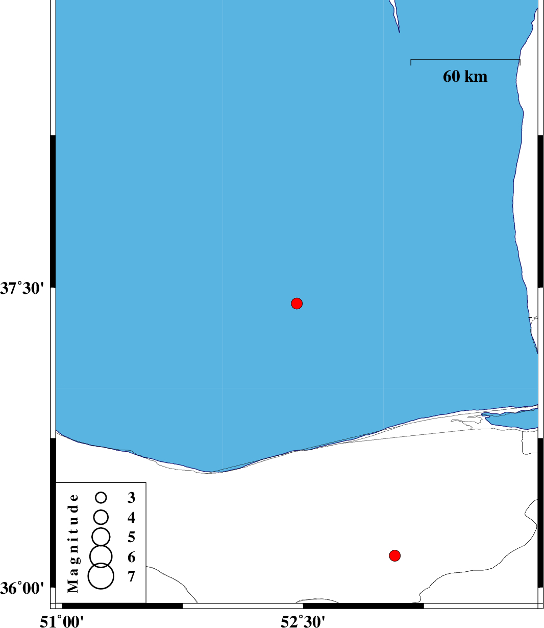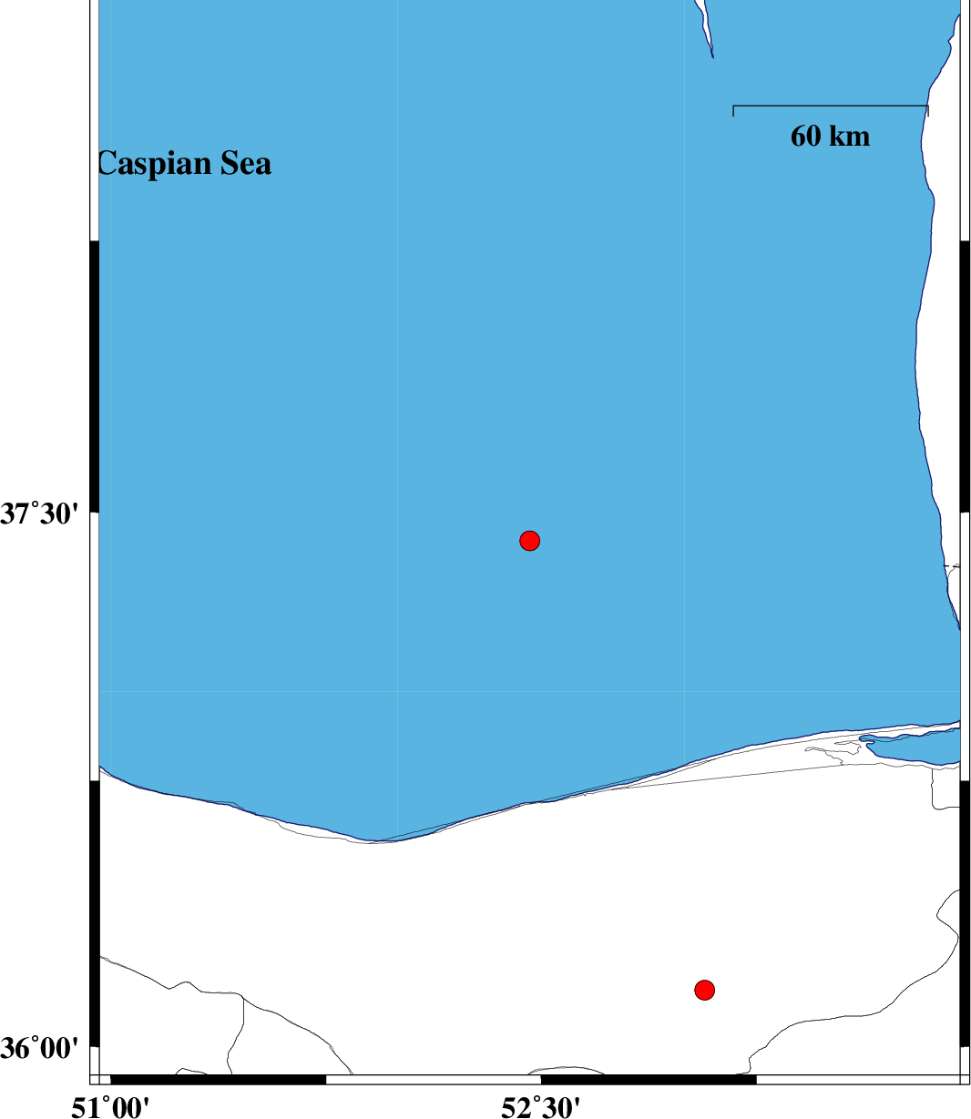 | 2019/06/20 | 21:54:37.7 | 02:24:37.7 | 37.42 | 52.46 | 12 | ML3.1 | Caspian Sea, 82 km North-West of Babolsar | ||