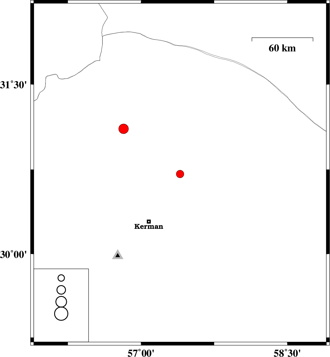 | 2019/06/18 | 12:02:49.4 | 16:32:49.4 | 30.71 | 57.4 | 14 | ML3.5 | Kerman Province, 56 km North-East of Kerman | ||