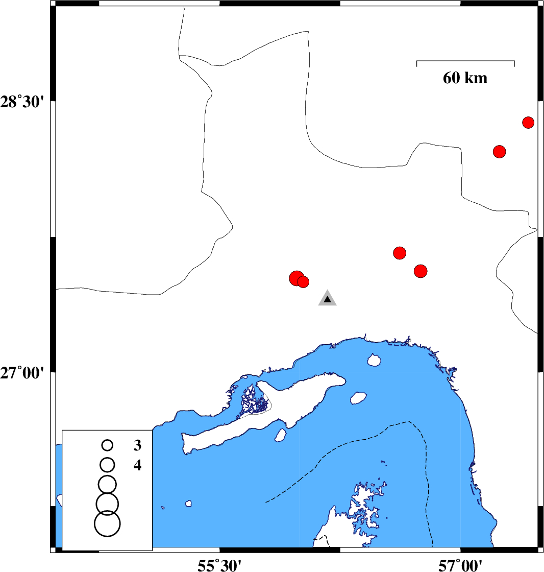 | 2019/06/17 | 13:32:25.8 | 18:02:25.8 | 27.54 | 55.94 | 10 | ML4.3 | Hormozgan Province, 52 km North-West of Bandar-e abbas | ||