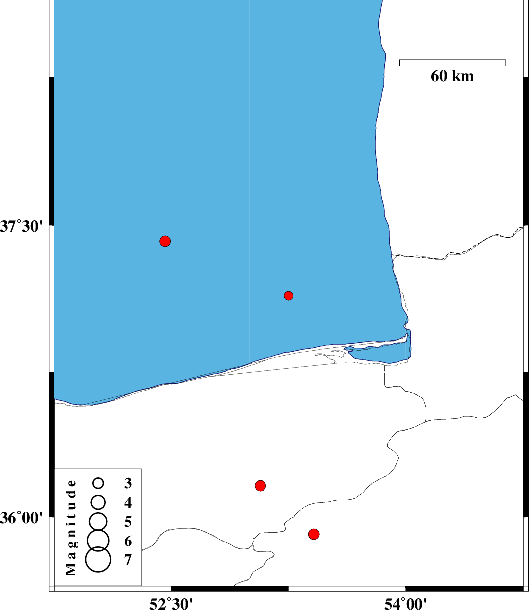 | 2019/06/20 | 21:54:37.7 | 02:24:37.7 | 37.42 | 52.46 | 12 | ML3.1 | Caspian Sea, 82 km North-West of Babolsar | ||
