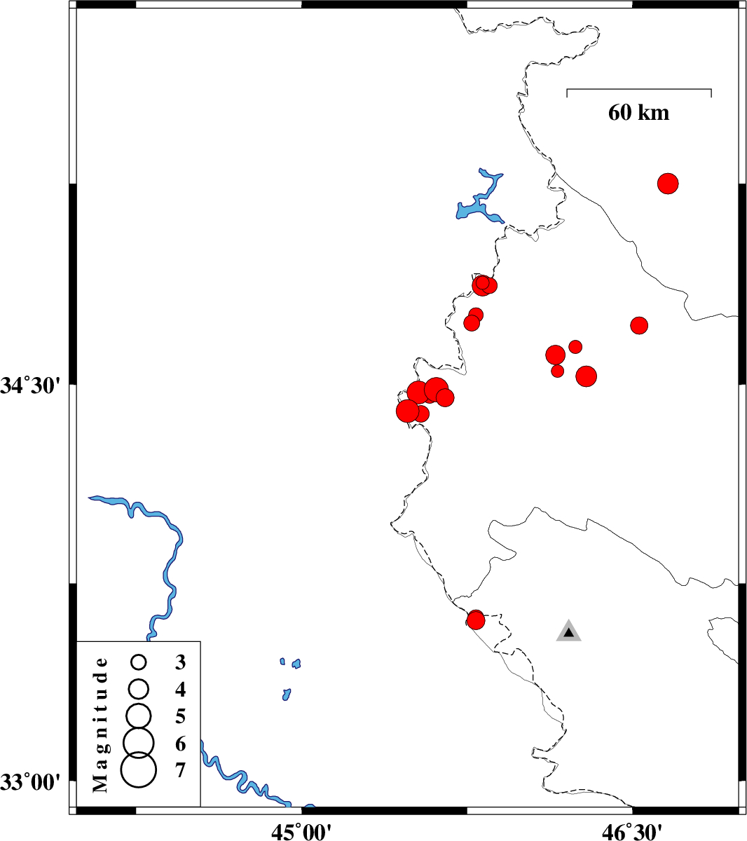 | 2019/06/12 | 18:02:58.5 | 22:32:58.5 | 34.45 | 45.65 | 14 | ML3.7 | Kermanshah Province, 10 km of Qasr-E-Shirin | ||