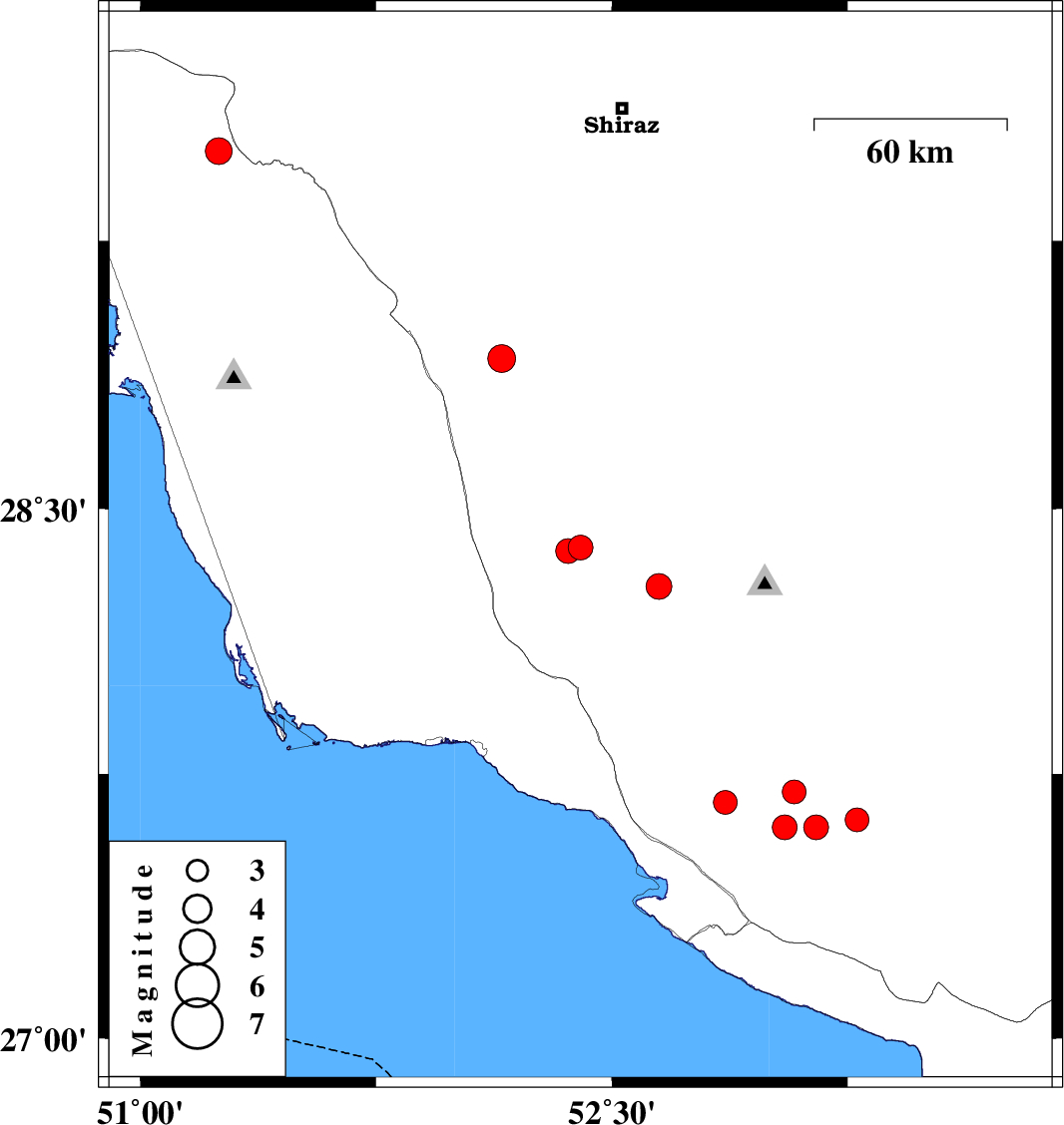 | 2019/05/24 | 09:25:15.9 | 13:55:15.9 | 28.92 | 52.15 | 8 | ML4 | Fars Province, 8 km of Farashband |