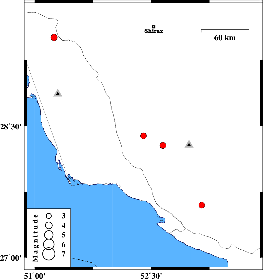 | 2019/06/22 | 01:34:53.5 | 06:04:53.5 | 29.5 | 51.25 | 10 | ML3.8 | Bushehr Province, 27 km North of Borazjan |