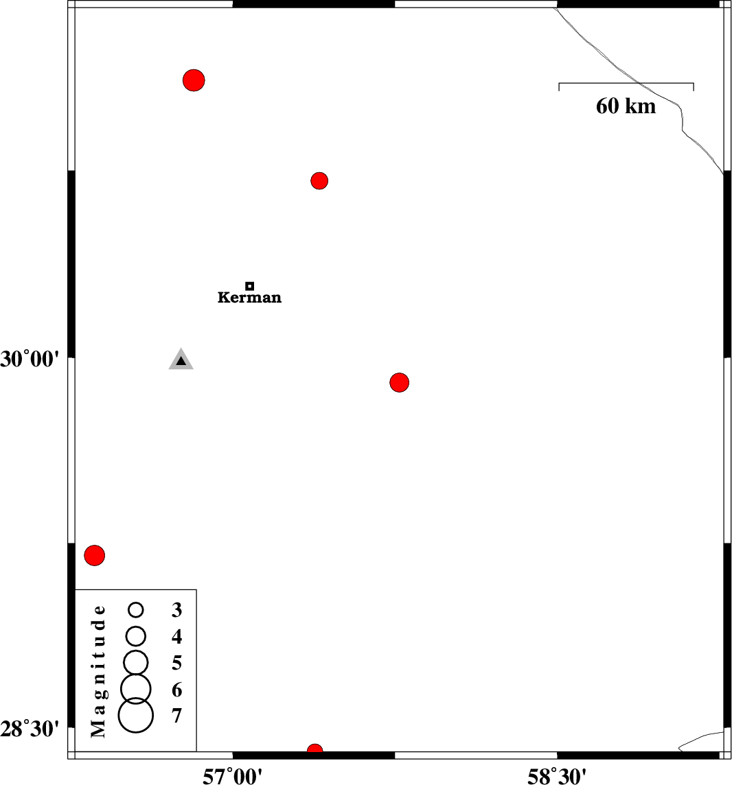 | 2019/06/18 | 12:02:49.4 | 16:32:49.4 | 30.71 | 57.4 | 14 | ML3.5 | Kerman Province, 56 km North-East of Kerman | ||