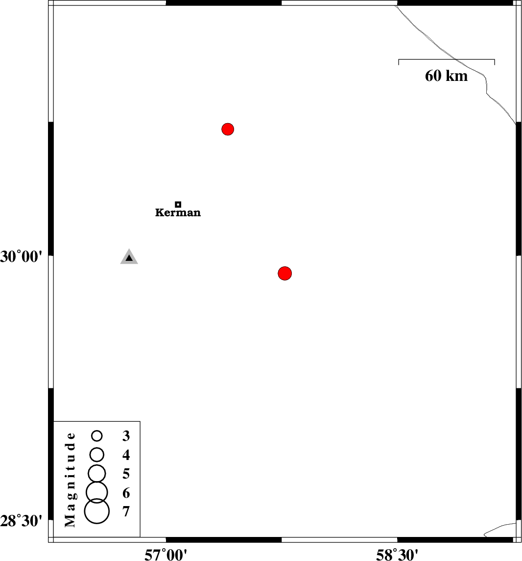 | 2019/06/18 | 12:02:49.4 | 16:32:49.4 | 30.71 | 57.4 | 14 | ML3.5 | Kerman Province, 56 km North-East of Kerman |
