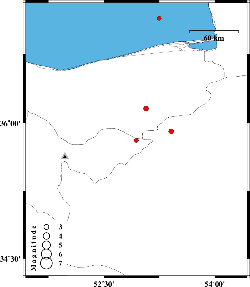 2019/05/25 | 20:34:01.3 | 01:04:01.3 | 35.91 | 53.41 | 12 | ML:3.1 | Semnan Province, 38 km North of Semnan |