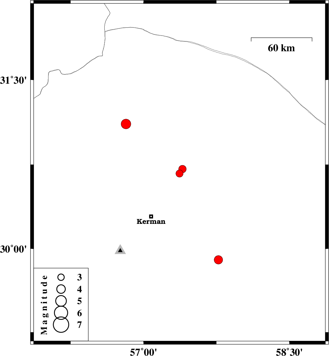 | 2019/06/18 | 12:02:49.4 | 16:32:49.4 | 30.71 | 57.4 | 14 | ML3.5 | Kerman Province, 56 km North-East of Kerman | ||