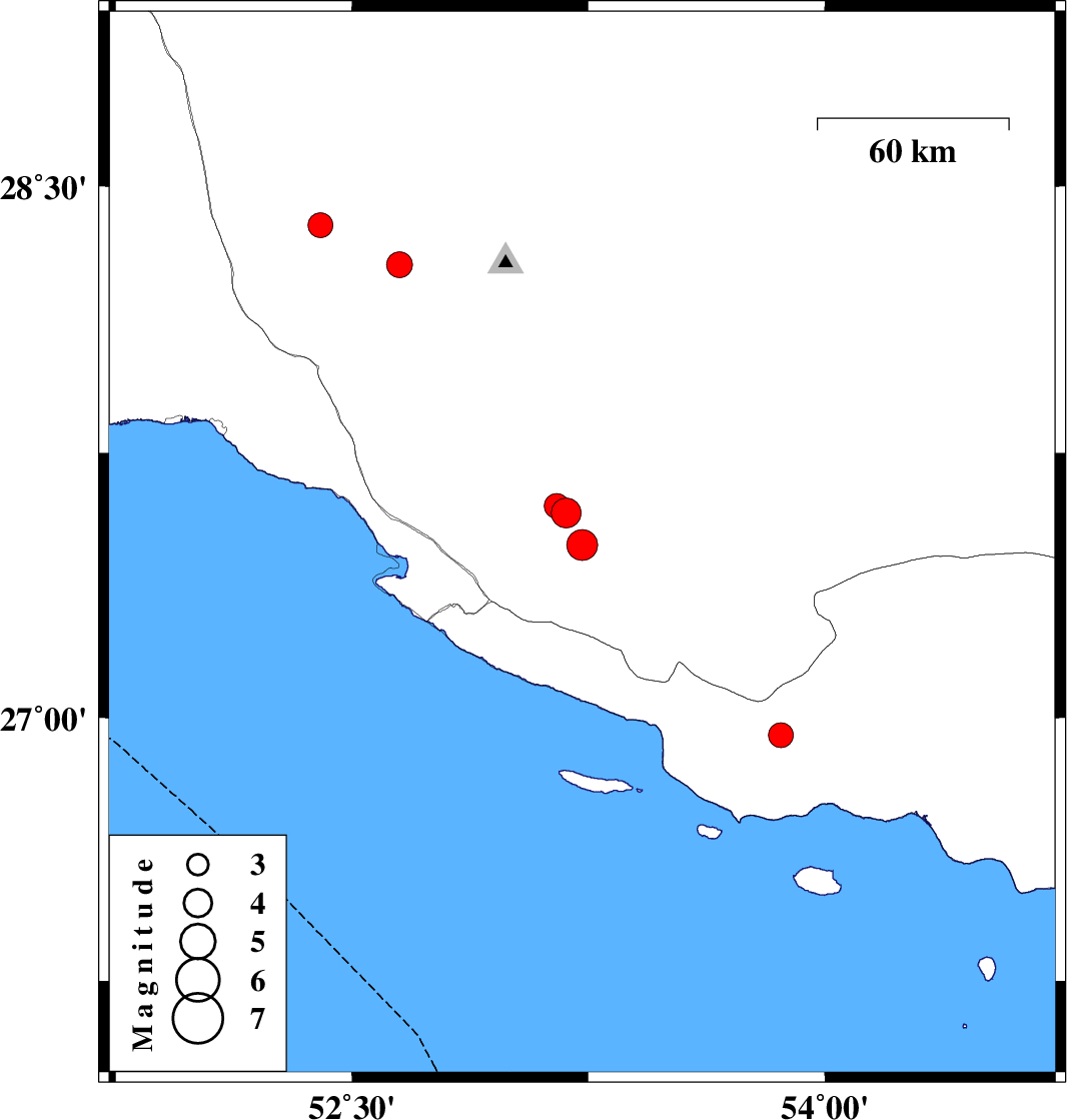 | 2019/06/22 | 06:28:11.5 | 10:58:11.5 | 28.28 | 52.65 | 18 | Mb3.7 | Fars Province, 43 km South-West of Qir va Karzin |