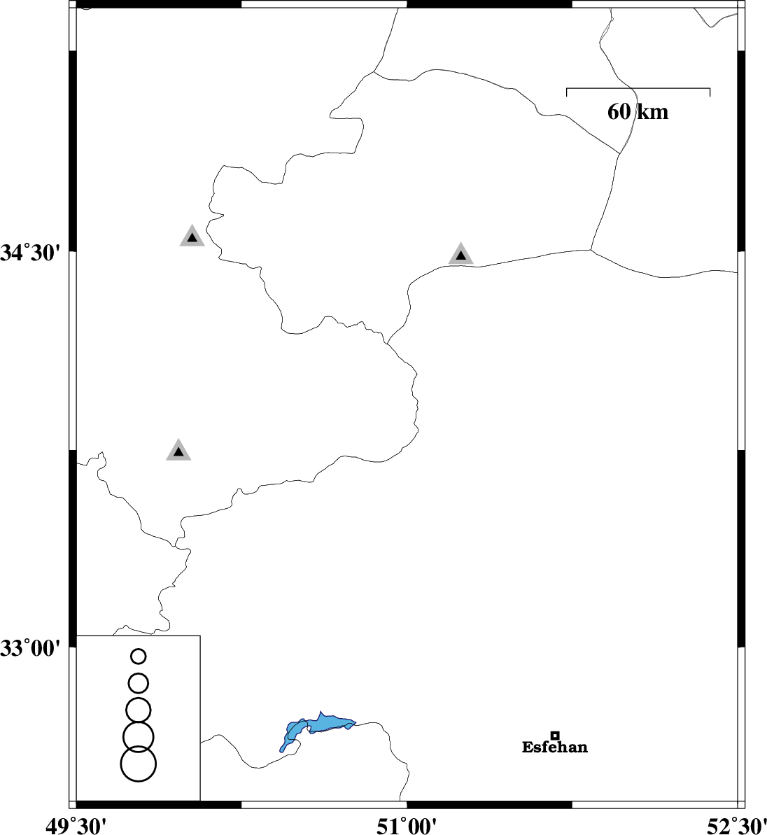 | 2019/06/28 | 19:43:09.1 | 00:13:09.1 | 33.91 | 51 | 10 | ML2.9 | Markazi Province, 31 km -East of Delijan |