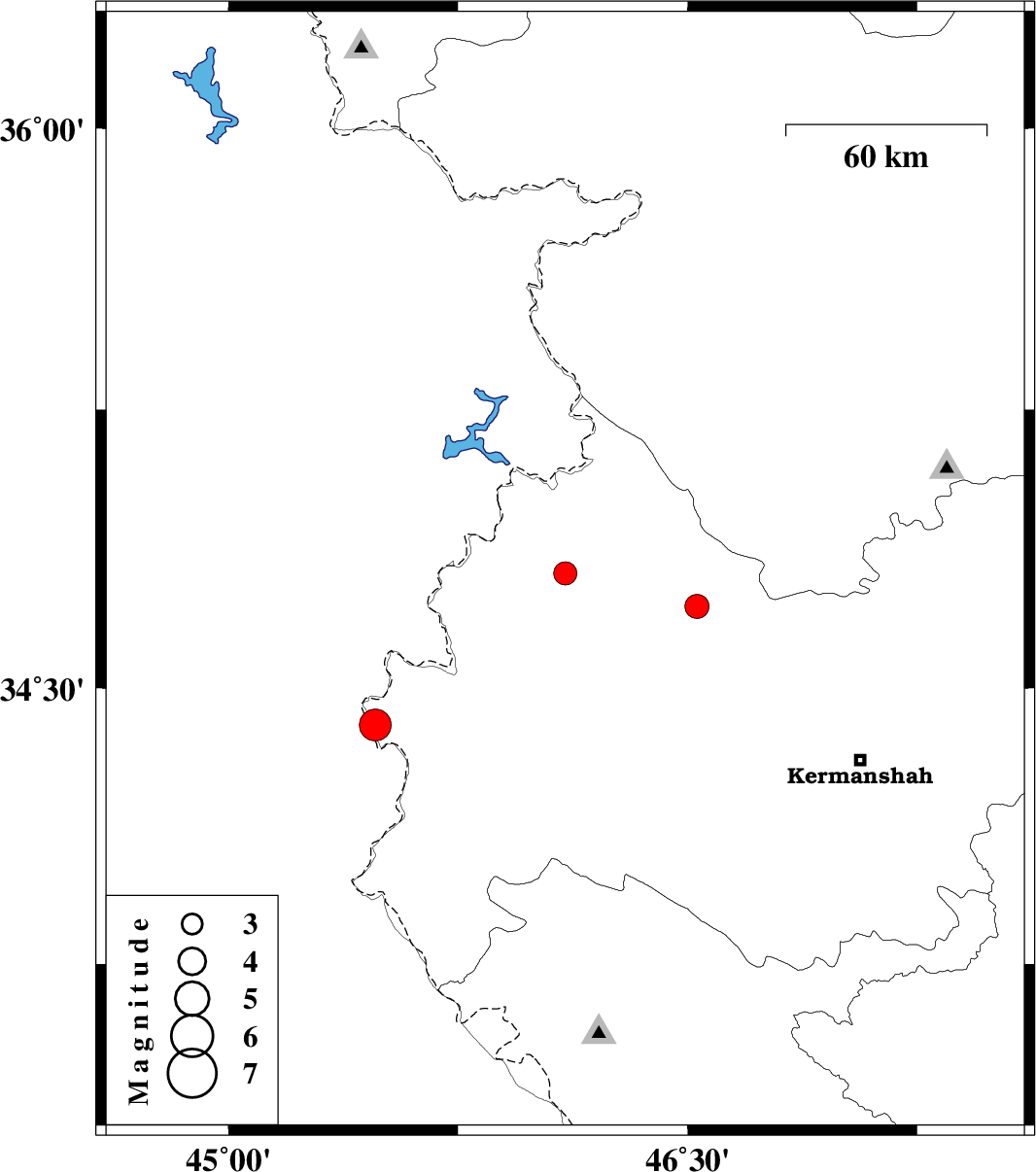 | 2019/06/22 | 18:07:11.1 | 22:37:11.1 | 34.72 | 46.53 | 10 | ML3.5 | Kermanshah Province, 14 km South of Javanrud |