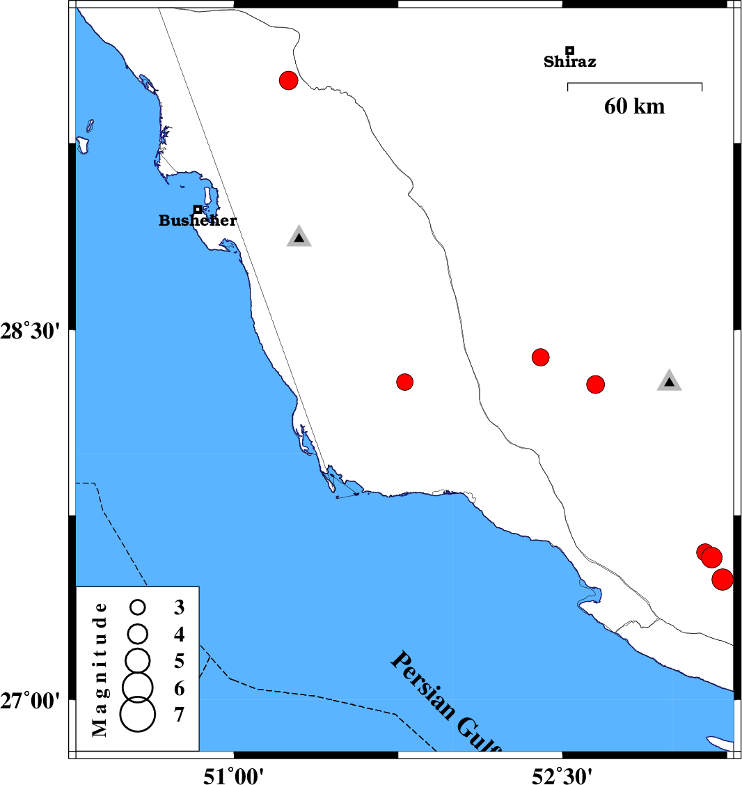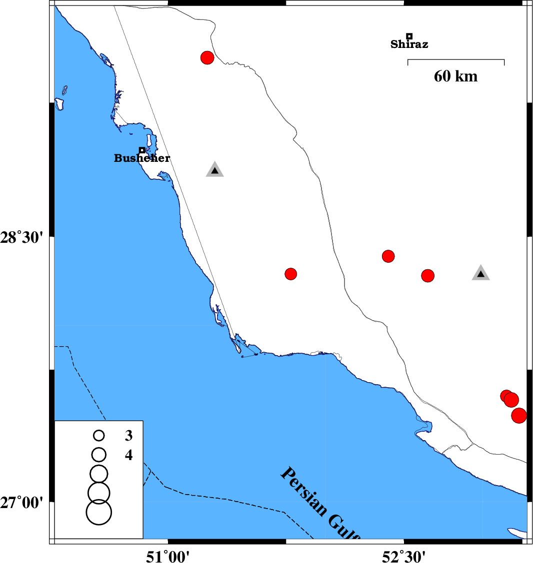 | 2019/06/22 | 01:34:53.5 | 06:04:53.5 | 29.5 | 51.25 | 10 | ML3.8 | Bushehr Province, 27 km North of Borazjan |