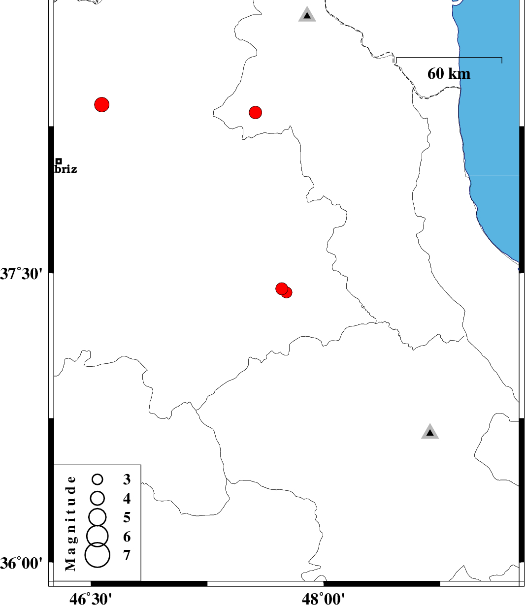 | 2019/06/07 | 21:42:04.2 | 02:12:04.2 | 38.36 | 46.57 | 10 | ML4.2 | Azarbaijan Sharghi Province, 40 km North-East of Tabriz |