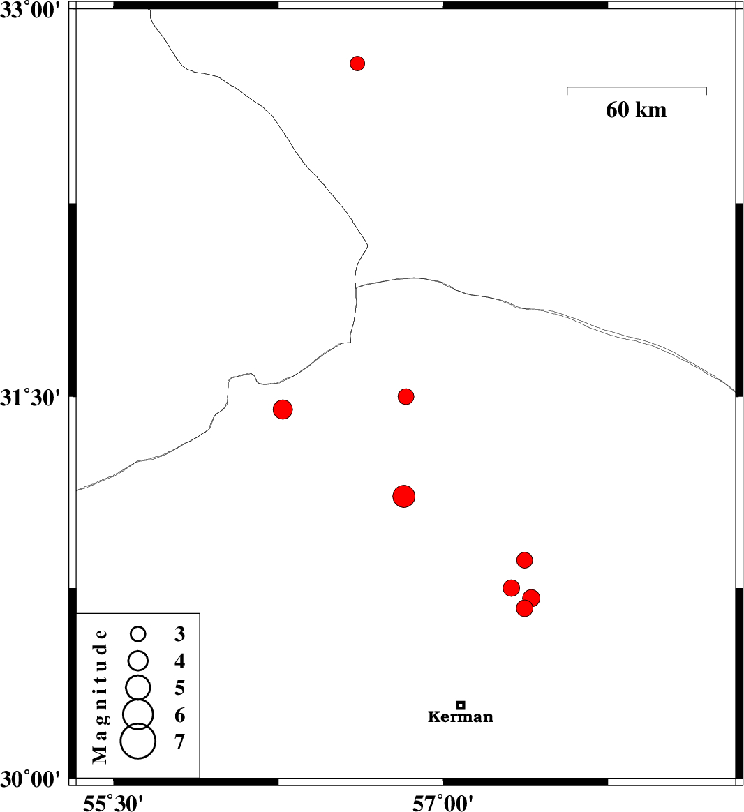 | 2019/06/18 | 12:02:49.4 | 16:32:49.4 | 30.71 | 57.4 | 14 | ML3.5 | Kerman Province, 56 km North-East of Kerman | ||