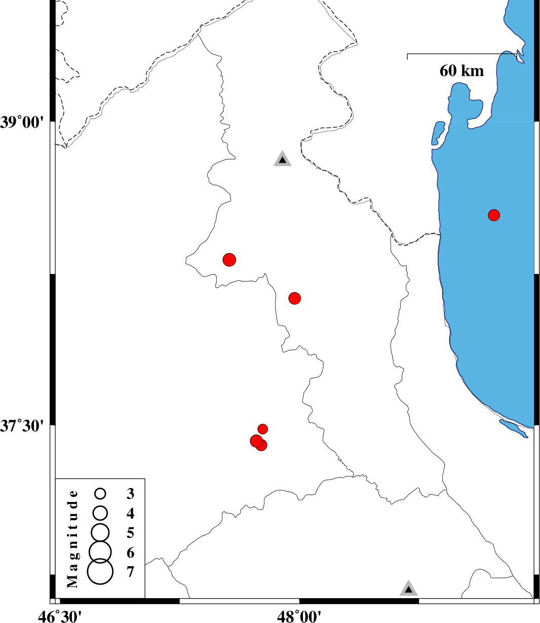 2019/06/30 | 04:37:02.7 | 09:07:02.7 | 37.42 | 47.73 | 12 | ML:3.5 | Azarbaijan Sharghi Province, 1 km of Mianeh | ||