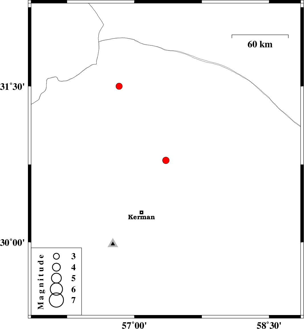 | 2019/07/06 | 07:28:22.7 | 11:58:22.7 | 31.5 | 56.83 | 14 | ML3.3 | Kerman Province, 26 km North of Ravar |