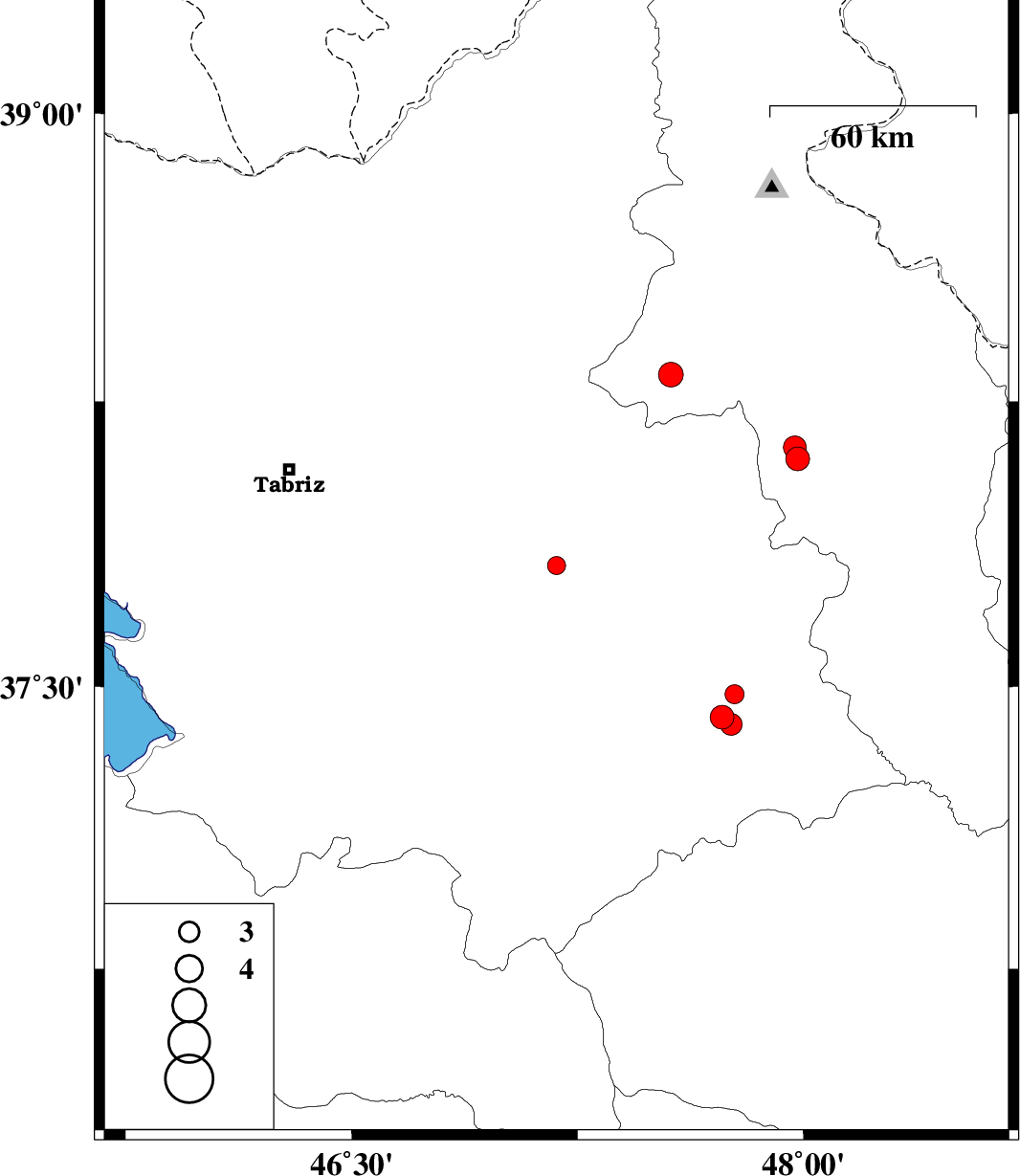 2019/06/15 | 22:34:08.1 | 03:04:08.1 | 38.32 | 47.56 | 10 | ML3.6 | Ardebil Province, 14 km -West of Meshgin Shahr |
