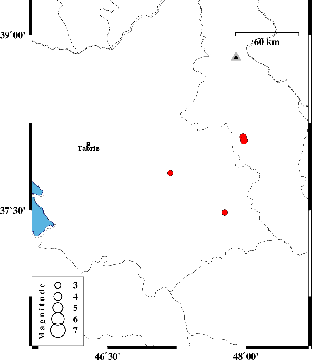 | 2019/07/12 | 16:20:27.1 | 20:50:27.1 | 38.13 | 47.97 | 14 | ML3.4 | Ardebil Province, 15 km -West of Nir |