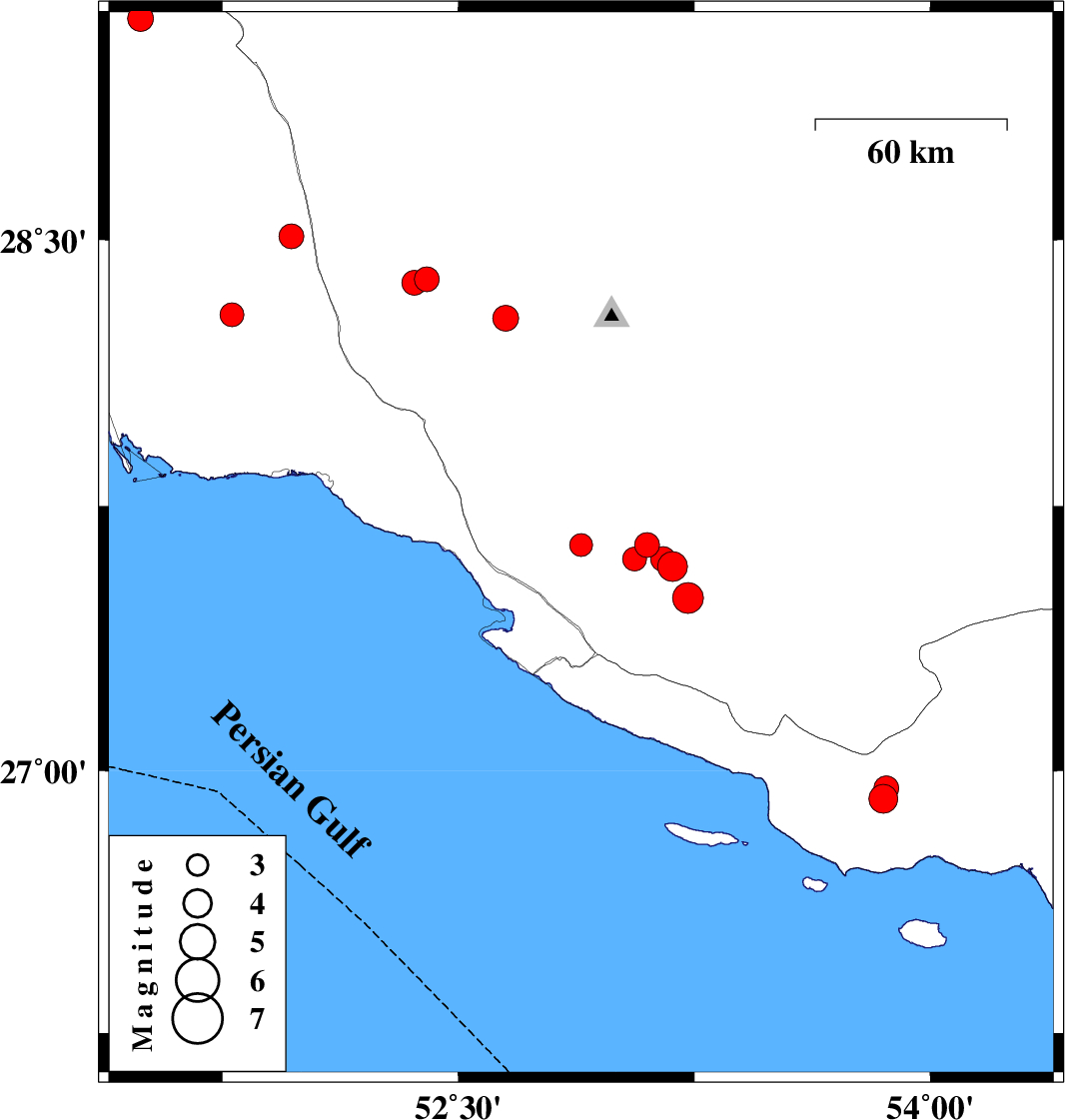 | 2019/06/29 | 11:09:31.8 | 15:39:31.8 | 28.29 | 51.78 | 28 | ML3.4 | Bushehr Province, 58 km North-West of Bandar-e kangan | ||