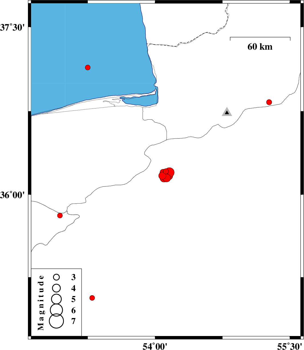 | 2019/06/21 | 20:58:49.2 | 01:28:49.2 | 37.14 | 53.25 | 10 | ML2.5 | Caspian Sea, 55 km North of Neka |